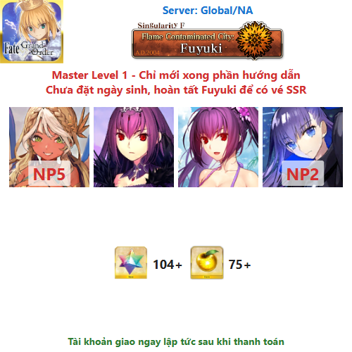 ⚠️ Vì tài khoản chưa hoàn tất chương đầu là Fuyuki, nên sẽ chưa có vé chọn SSR miễn phí, mọi người mua về chơi xong chương đầu sẽ có.