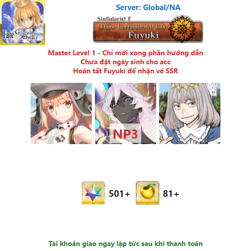 ⚠️ Vì tài khoản chưa hoàn tất chương đầu là Fuyuki, nên sẽ chưa có vé chọn SSR miễn phí, mọi người mua về chơi xong chương đầu sẽ có.