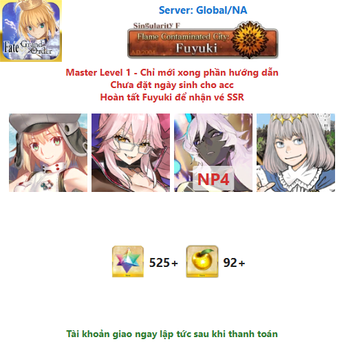 ⚠️ Vì tài khoản chưa hoàn tất chương đầu là Fuyuki, nên sẽ chưa có vé chọn SSR miễn phí, mọi người mua về chơi xong chương đầu sẽ có.