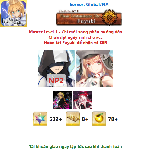 ⚠️ Vì tài khoản chưa hoàn tất chương đầu là Fuyuki, nên sẽ chưa có vé chọn SSR miễn phí, mọi người mua về chơi xong chương đầu sẽ có.