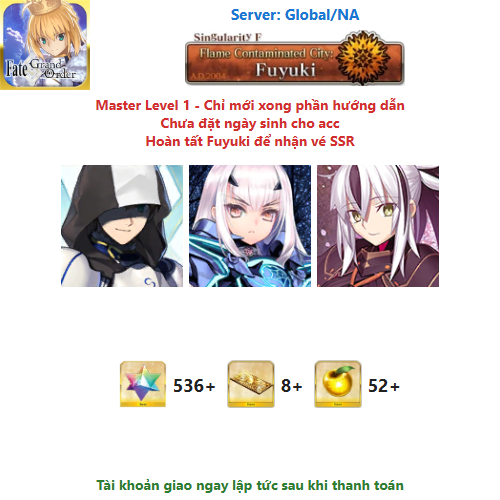 ⚠️ Vì tài khoản chưa hoàn tất chương đầu là Fuyuki, nên sẽ chưa có vé chọn SSR miễn phí, mọi người mua về chơi xong chương đầu sẽ có.