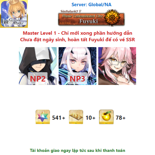 ⚠️ Vì tài khoản chưa hoàn tất chương đầu là Fuyuki, nên sẽ chưa có vé chọn SSR miễn phí, mọi người mua về chơi xong chương đầu sẽ có.