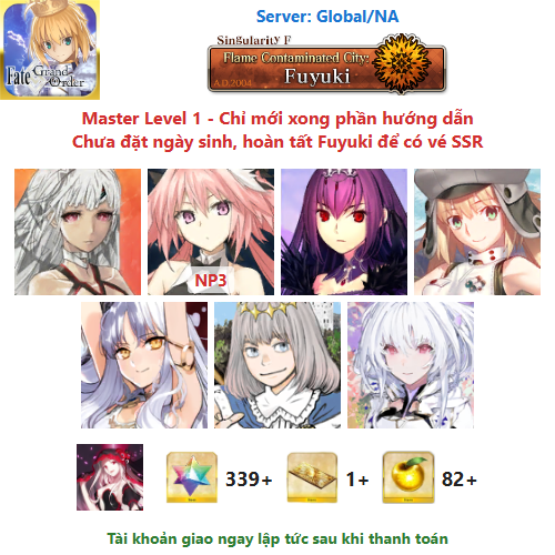 ⚠️ Vì tài khoản chưa hoàn tất chương đầu là Fuyuki, nên sẽ chưa có vé chọn SSR miễn phí, mọi người mua về chơi xong chương đầu sẽ có.