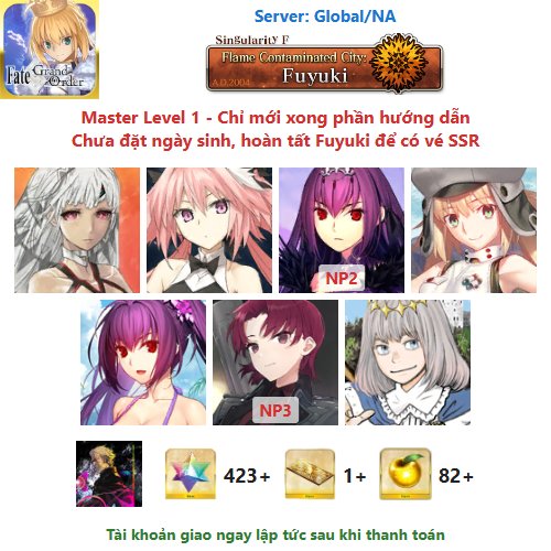 ⚠️ Vì tài khoản chưa hoàn tất chương đầu là Fuyuki, nên sẽ chưa có vé chọn SSR miễn phí, mọi người mua về chơi xong chương đầu sẽ có.