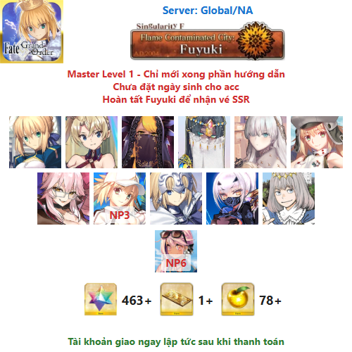 ⚠️ Vì tài khoản chưa hoàn tất chương đầu là Fuyuki, nên sẽ chưa có vé chọn SSR miễn phí, mọi người mua về chơi xong chương đầu sẽ có.