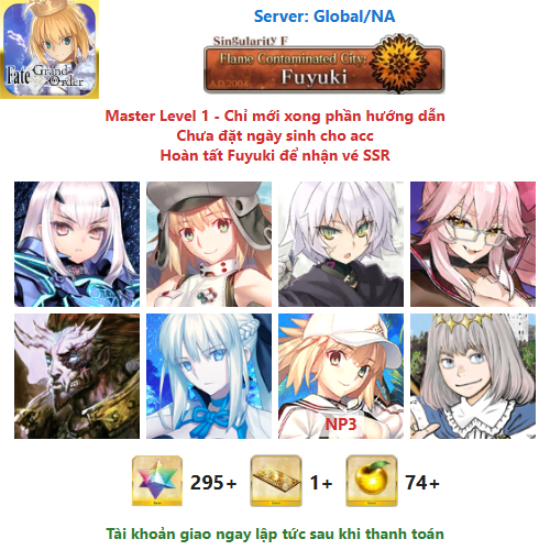 ⚠️ Vì tài khoản chưa hoàn tất chương đầu là Fuyuki, nên sẽ chưa có vé chọn SSR miễn phí, mọi người mua về chơi xong chương đầu sẽ có.
