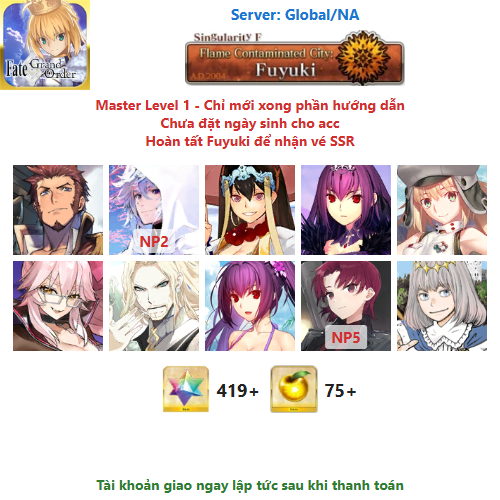 ⚠️ Vì tài khoản chưa hoàn tất chương đầu là Fuyuki, nên sẽ chưa có vé chọn SSR miễn phí, mọi người mua về chơi xong chương đầu sẽ có.