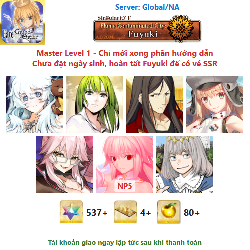 ⚠️ Vì tài khoản chưa hoàn tất chương đầu là Fuyuki, nên sẽ chưa có vé chọn SSR miễn phí, mọi người mua về chơi xong chương đầu sẽ có.
