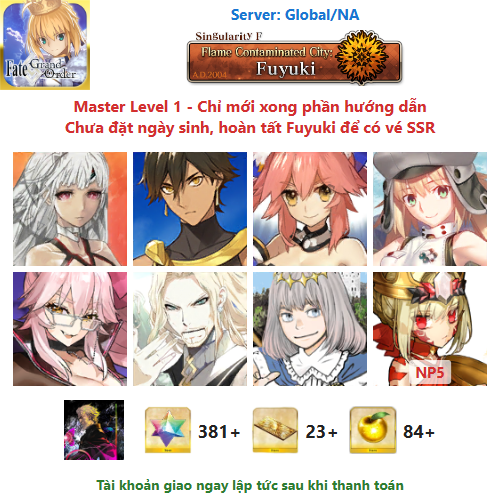 ⚠️ Vì tài khoản chưa hoàn tất chương đầu là Fuyuki, nên sẽ chưa có vé chọn SSR miễn phí, mọi người mua về chơi xong chương đầu sẽ có.