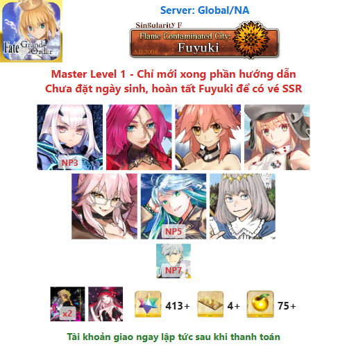 ⚠️ Vì tài khoản chưa hoàn tất chương đầu là Fuyuki, nên sẽ chưa có vé chọn SSR miễn phí, mọi người mua về chơi xong chương đầu sẽ có.