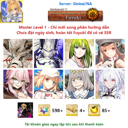 ⚠️ Vì tài khoản chưa hoàn tất chương đầu là Fuyuki, nên sẽ chưa có vé chọn SSR miễn phí, mọi người mua về chơi xong chương đầu sẽ có.
