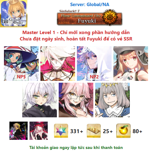 ⚠️ Vì tài khoản chưa hoàn tất chương đầu là Fuyuki, nên sẽ chưa có vé chọn SSR miễn phí, mọi người mua về chơi xong chương đầu sẽ có.