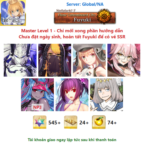 ⚠️ Vì tài khoản chưa hoàn tất chương đầu là Fuyuki, nên sẽ chưa có vé chọn SSR miễn phí, mọi người mua về chơi xong chương đầu sẽ có.
