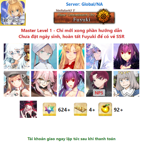⚠️ Vì tài khoản chưa hoàn tất chương đầu là Fuyuki, nên sẽ chưa có vé chọn SSR miễn phí, mọi người mua về chơi xong chương đầu sẽ có.