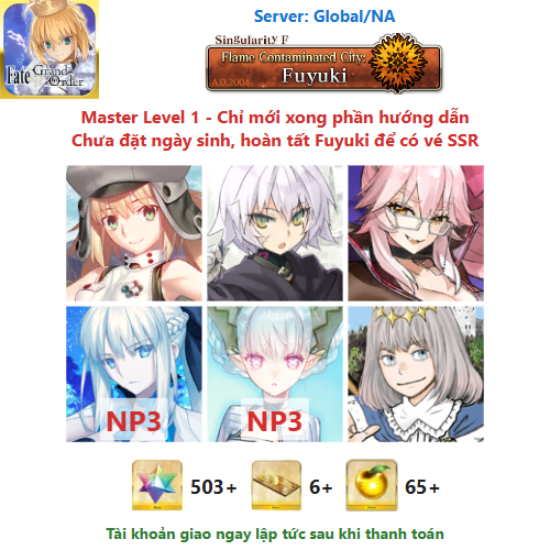 ⚠️ Vì tài khoản chưa hoàn tất chương đầu là Fuyuki, nên sẽ chưa có vé chọn SSR miễn phí, mọi người mua về chơi xong chương đầu sẽ có.