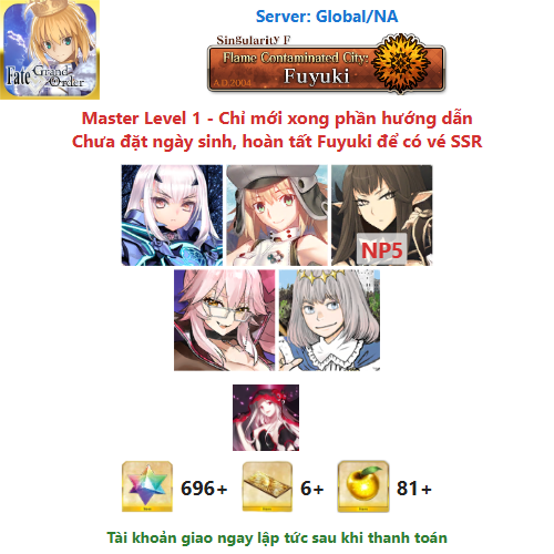 ⚠️ Vì tài khoản chưa hoàn tất chương đầu là Fuyuki, nên sẽ chưa có vé chọn SSR miễn phí, mọi người mua về chơi xong chương đầu sẽ có.