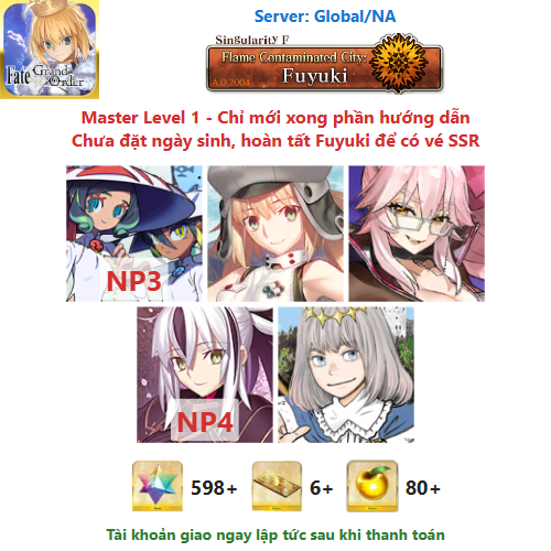 ⚠️ Vì tài khoản chưa hoàn tất chương đầu là Fuyuki, nên sẽ chưa có vé chọn SSR miễn phí, mọi người mua về chơi xong chương đầu sẽ có.
