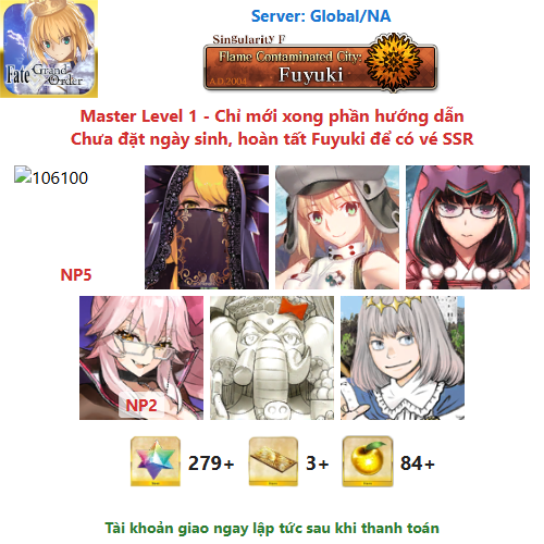 ⚠️ Vì tài khoản chưa hoàn tất chương đầu là Fuyuki, nên sẽ chưa có vé chọn SSR miễn phí, mọi người mua về chơi xong chương đầu sẽ có.