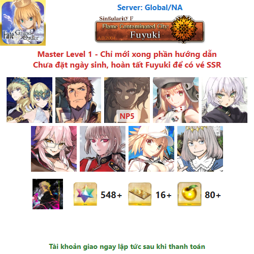 ⚠️ Vì tài khoản chưa hoàn tất chương đầu là Fuyuki, nên sẽ chưa có vé chọn SSR miễn phí, mọi người mua về chơi xong chương đầu sẽ có.