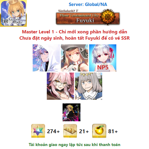 ⚠️ Vì tài khoản chưa hoàn tất chương đầu là Fuyuki, nên sẽ chưa có vé chọn SSR miễn phí, mọi người mua về chơi xong chương đầu sẽ có.