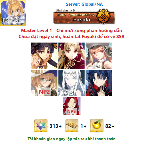 ⚠️ Vì tài khoản chưa hoàn tất chương đầu là Fuyuki, nên sẽ chưa có vé chọn SSR miễn phí, mọi người mua về chơi xong chương đầu sẽ có.