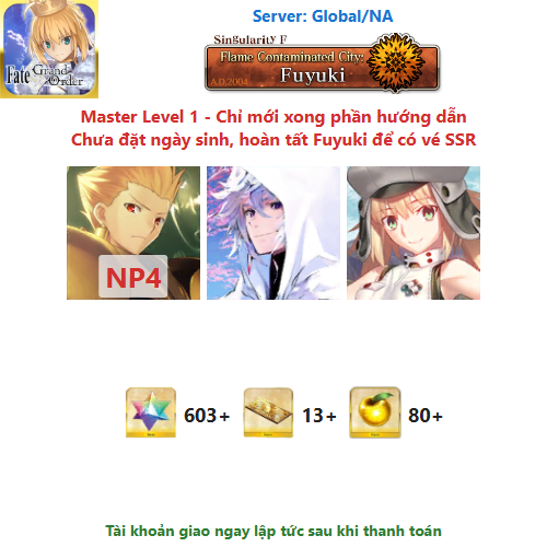 ⚠️ Vì tài khoản chưa hoàn tất chương đầu là Fuyuki, nên sẽ chưa có vé chọn SSR miễn phí, mọi người mua về chơi xong chương đầu sẽ có.