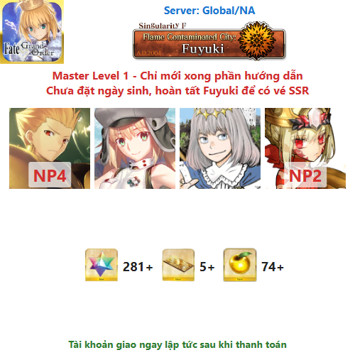 ⚠️ Vì tài khoản chưa hoàn tất chương đầu là Fuyuki, nên sẽ chưa có vé chọn SSR miễn phí, mọi người mua về chơi xong chương đầu sẽ có.