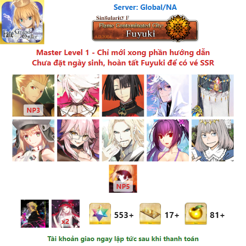 ⚠️ Vì tài khoản chưa hoàn tất chương đầu là Fuyuki, nên sẽ chưa có vé chọn SSR miễn phí, mọi người mua về chơi xong chương đầu sẽ có.