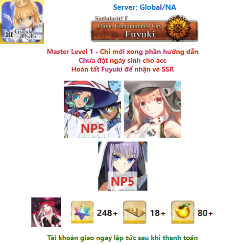 ⚠️ Vì tài khoản chưa hoàn tất chương đầu là Fuyuki, nên sẽ chưa có vé chọn SSR miễn phí, mọi người mua về chơi xong chương đầu sẽ có.