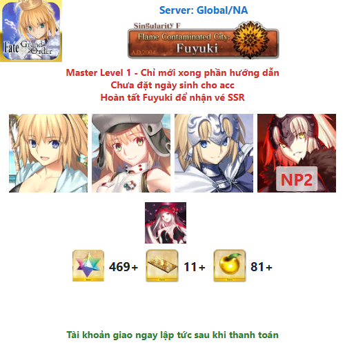 ⚠️ Vì tài khoản chưa hoàn tất chương đầu là Fuyuki, nên sẽ chưa có vé chọn SSR miễn phí, mọi người mua về chơi xong chương đầu sẽ có.