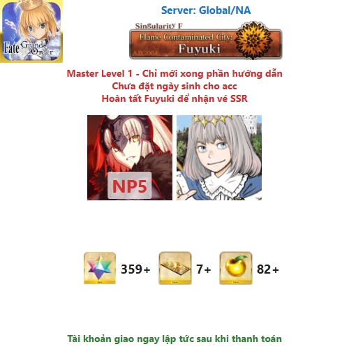⚠️ Vì tài khoản chưa hoàn tất chương đầu là Fuyuki, nên sẽ chưa có vé chọn SSR miễn phí, mọi người mua về chơi xong chương đầu sẽ có.