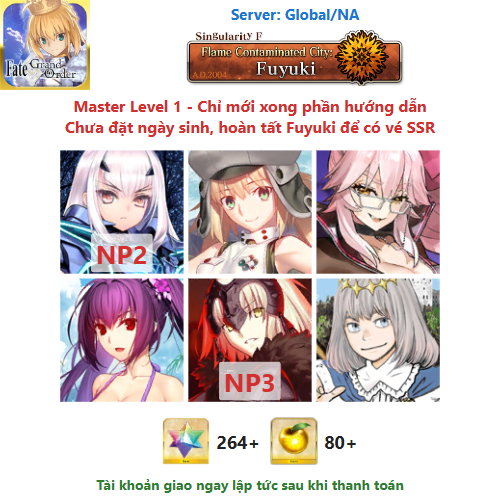 ⚠️ Vì tài khoản chưa hoàn tất chương đầu là Fuyuki, nên sẽ chưa có vé chọn SSR miễn phí, mọi người mua về chơi xong chương đầu sẽ có.