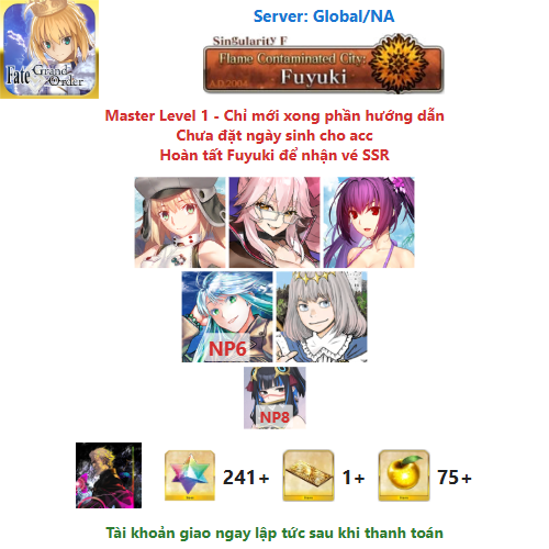 ⚠️ Vì tài khoản chưa hoàn tất chương đầu là Fuyuki, nên sẽ chưa có vé chọn SSR miễn phí, mọi người mua về chơi xong chương đầu sẽ có.