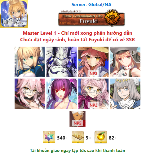 ⚠️ Vì tài khoản chưa hoàn tất chương đầu là Fuyuki, nên sẽ chưa có vé chọn SSR miễn phí, mọi người mua về chơi xong chương đầu sẽ có.