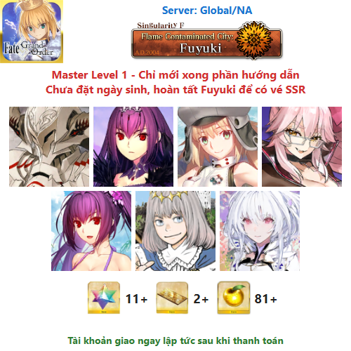 ⚠️ Vì tài khoản chưa hoàn tất chương đầu là Fuyuki, nên sẽ chưa có vé chọn SSR miễn phí, mọi người mua về chơi xong chương đầu sẽ có.