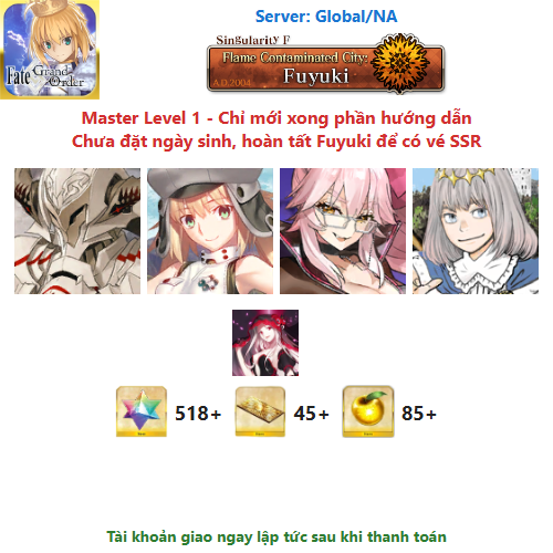 ⚠️ Vì tài khoản chưa hoàn tất chương đầu là Fuyuki, nên sẽ chưa có vé chọn SSR miễn phí, mọi người mua về chơi xong chương đầu sẽ có.