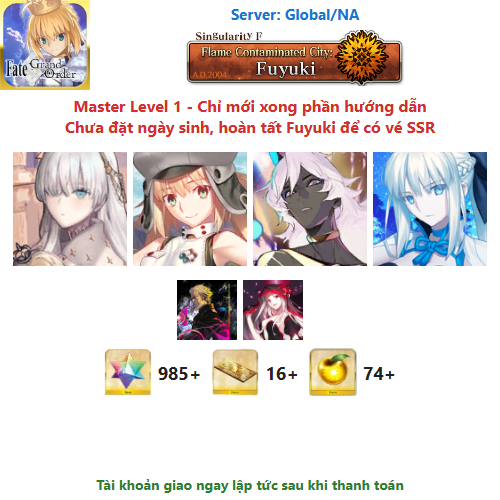 ⚠️ Vì tài khoản chưa hoàn tất chương đầu là Fuyuki, nên sẽ chưa có vé chọn SSR miễn phí, mọi người mua về chơi xong chương đầu sẽ có.