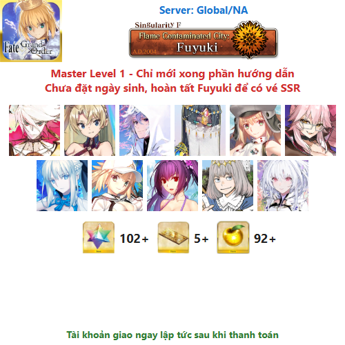 ⚠️ Vì tài khoản chưa hoàn tất chương đầu là Fuyuki, nên sẽ chưa có vé chọn SSR miễn phí, mọi người mua về chơi xong chương đầu sẽ có.