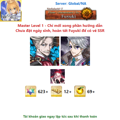⚠️ Vì tài khoản chưa hoàn tất chương đầu là Fuyuki, nên sẽ chưa có vé chọn SSR miễn phí, mọi người mua về chơi xong chương đầu sẽ có.