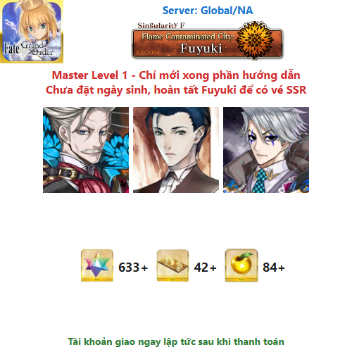 ⚠️ Vì tài khoản chưa hoàn tất chương đầu là Fuyuki, nên sẽ chưa có vé chọn SSR miễn phí, mọi người mua về chơi xong chương đầu sẽ có.