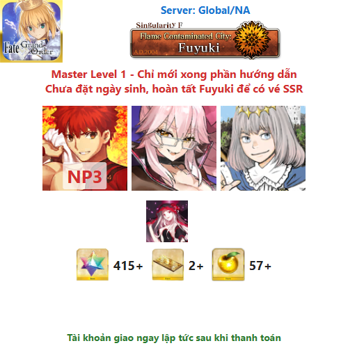 ⚠️ Vì tài khoản chưa hoàn tất chương đầu là Fuyuki, nên sẽ chưa có vé chọn SSR miễn phí, mọi người mua về chơi xong chương đầu sẽ có.