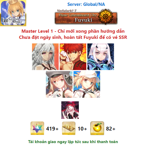 ⚠️ Vì tài khoản chưa hoàn tất chương đầu là Fuyuki, nên sẽ chưa có vé chọn SSR miễn phí, mọi người mua về chơi xong chương đầu sẽ có.