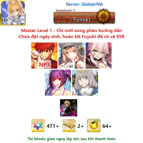 ⚠️ Vì tài khoản chưa hoàn tất chương đầu là Fuyuki, nên sẽ chưa có vé chọn SSR miễn phí, mọi người mua về chơi xong chương đầu sẽ có.