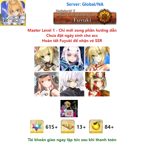 ⚠️ Vì tài khoản chưa hoàn tất chương đầu là Fuyuki, nên sẽ chưa có vé chọn SSR miễn phí, mọi người mua về chơi xong chương đầu sẽ có.