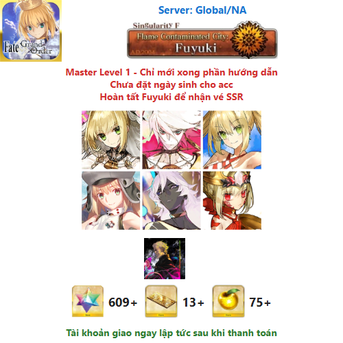 ⚠️ Vì tài khoản chưa hoàn tất chương đầu là Fuyuki, nên sẽ chưa có vé chọn SSR miễn phí, mọi người mua về chơi xong chương đầu sẽ có.