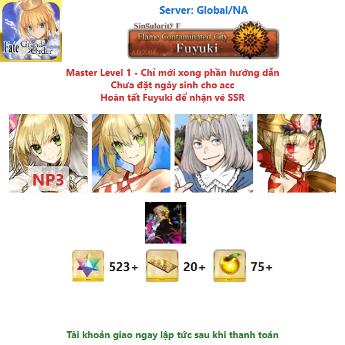 ⚠️ Vì tài khoản chưa hoàn tất chương đầu là Fuyuki, nên sẽ chưa có vé chọn SSR miễn phí, mọi người mua về chơi xong chương đầu sẽ có.