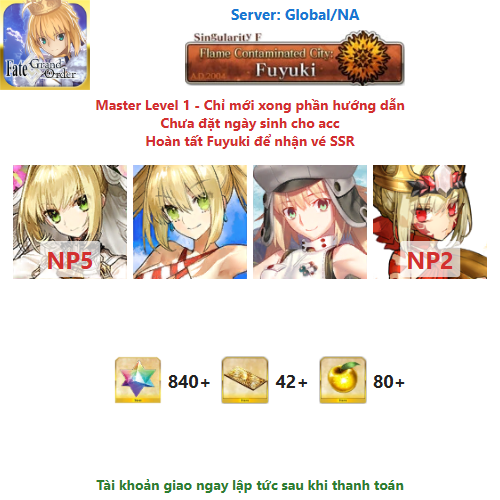 ⚠️ Vì tài khoản chưa hoàn tất chương đầu là Fuyuki, nên sẽ chưa có vé chọn SSR miễn phí, mọi người mua về chơi xong chương đầu sẽ có.