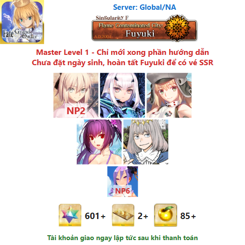 ⚠️ Vì tài khoản chưa hoàn tất chương đầu là Fuyuki, nên sẽ chưa có vé chọn SSR miễn phí, mọi người mua về chơi xong chương đầu sẽ có.