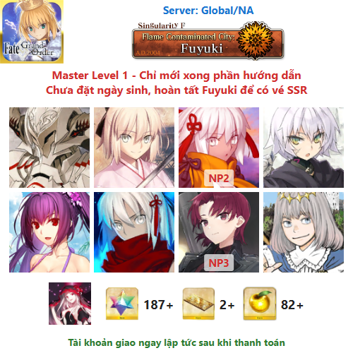 ⚠️ Vì tài khoản chưa hoàn tất chương đầu là Fuyuki, nên sẽ chưa có vé chọn SSR miễn phí, mọi người mua về chơi xong chương đầu sẽ có.