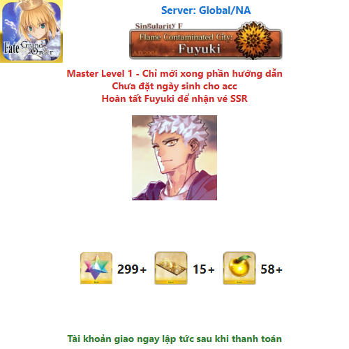 ⚠️ Vì tài khoản chưa hoàn tất chương đầu là Fuyuki, nên sẽ chưa có vé chọn SSR miễn phí, mọi người mua về chơi xong chương đầu sẽ có.